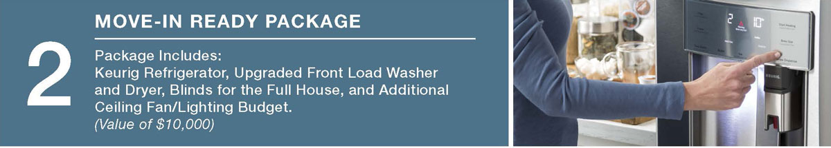 If you're one of those people that can't get rolling in the morning without a cup of coffee, then this deal is perfect for you! It includes an upgraded refrigerator with a built-in Keurig! That's right - quickly make your favorite cup of joe, tea, hot chocolate or whatever gets you going without cluttering up your gorgeous new counters with various appliances. That's not all that comes with this package though. We want your new Britton Home to be personalized just for you so we're including blinds throughout the entire home, upgraded front load washer and dryer and some extra money you can use towards lighting and ceiling fans.